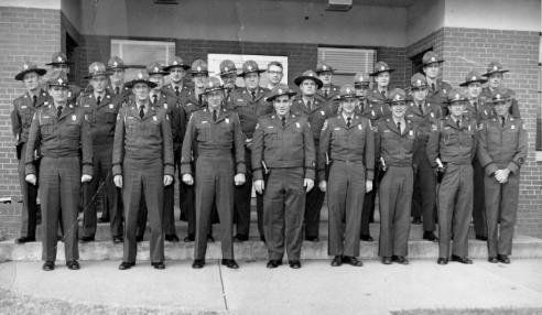This has been a difficult one to identify. Connie and Mary Watson did the best job. This is what we know at this time. 1963, Troop F, District 4, maybe even District 3. Front row, left to right - Cabe, Sullin, Pipes, Bowen, Wright, two unidentified, Almond. Second row, left to right - five unidentified, Arledge, Sawyer, Shuler, Frady. Third row, left to right - one unidentified, Long, possibly Caudle, Thompson, civilian, four unidentified. Some names mentioned but not sure on identity but were in Districts 3 and 4. Hussey, Kinkaid, Lackey, Jenkins Feldman, Patterson, maybe more.